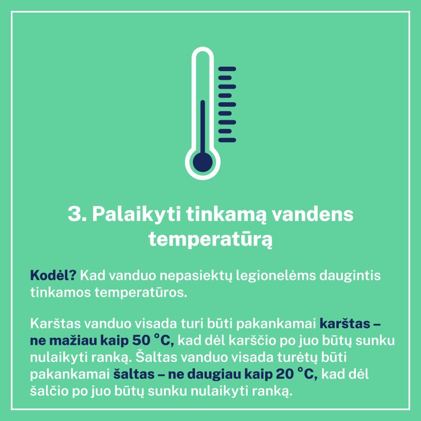 Nacionalinio visuomenės sveikatos centro (NVSC) specialistai atkreipia gyventojų, kurie geriamuoju vandeniu apsirūpina patys, tačiau dėl elektros sutrikimo jo dar neturi, dėmesį, kad atnaujinus vandens tiekimą reikia išleisti vamzdyne užsistovėjusį vandenį ir tinkamai paruošti (pakaitinti) karštą vandenį vandens šildytuvuose (boileriuose). Kad vandens sistemose neatsirastų sveikatai pavojingų bakterijų (legionelių), karštas vanduo visada turi būti pakankamai karštas (čiaupuose ne mažiau kaip 50 °C), o šaltas – visada pakankamai šaltas (ne daugiau kaip 20 °C). Šios taisyklės turėtų laikytis ir nuosavų ar daugiabučių namų gyventojai, kurie vandenį šildosi patys. Primename, kad nuo legioneliozės – ūminės infekcinės kvėpavimo takų ligos, kurią sukelia bakterijos – saugo profilaktinės priemonės: tinkamos vandens temperatūros palaikymas, nuolatinė vandens cirkuliacija ir…