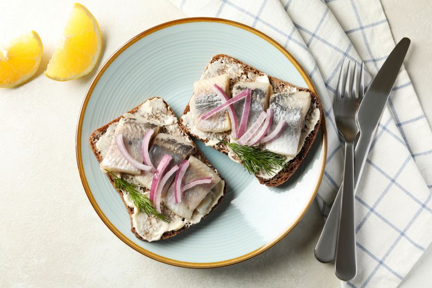 Jums reikės (2 porcijoms): 2 riekelių tamsios duonos, 50 g kreminės varškės, 50 g majonezo, žiupsnelio druskos ir pipirų, 50 g marinuotų agurkėlių, 100 g „Sødergärden“ marinuotos silkės, pusės mažojo raudonojo svogūno, 50 g mažų raudonųjų pomidorų, žiupsnelio įvairių žolelių ir šiek tiek juodųjų ikrų papuošimui.